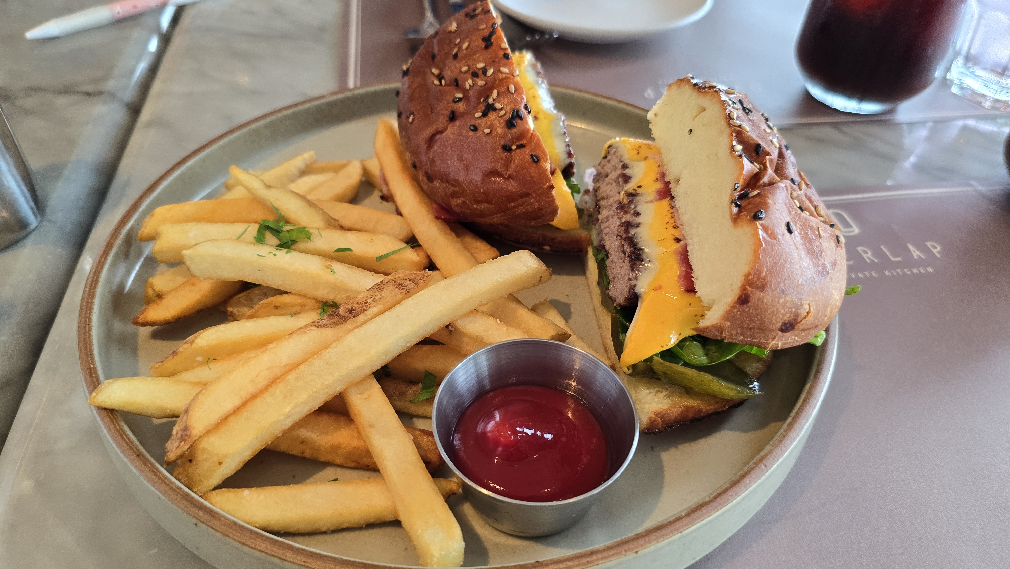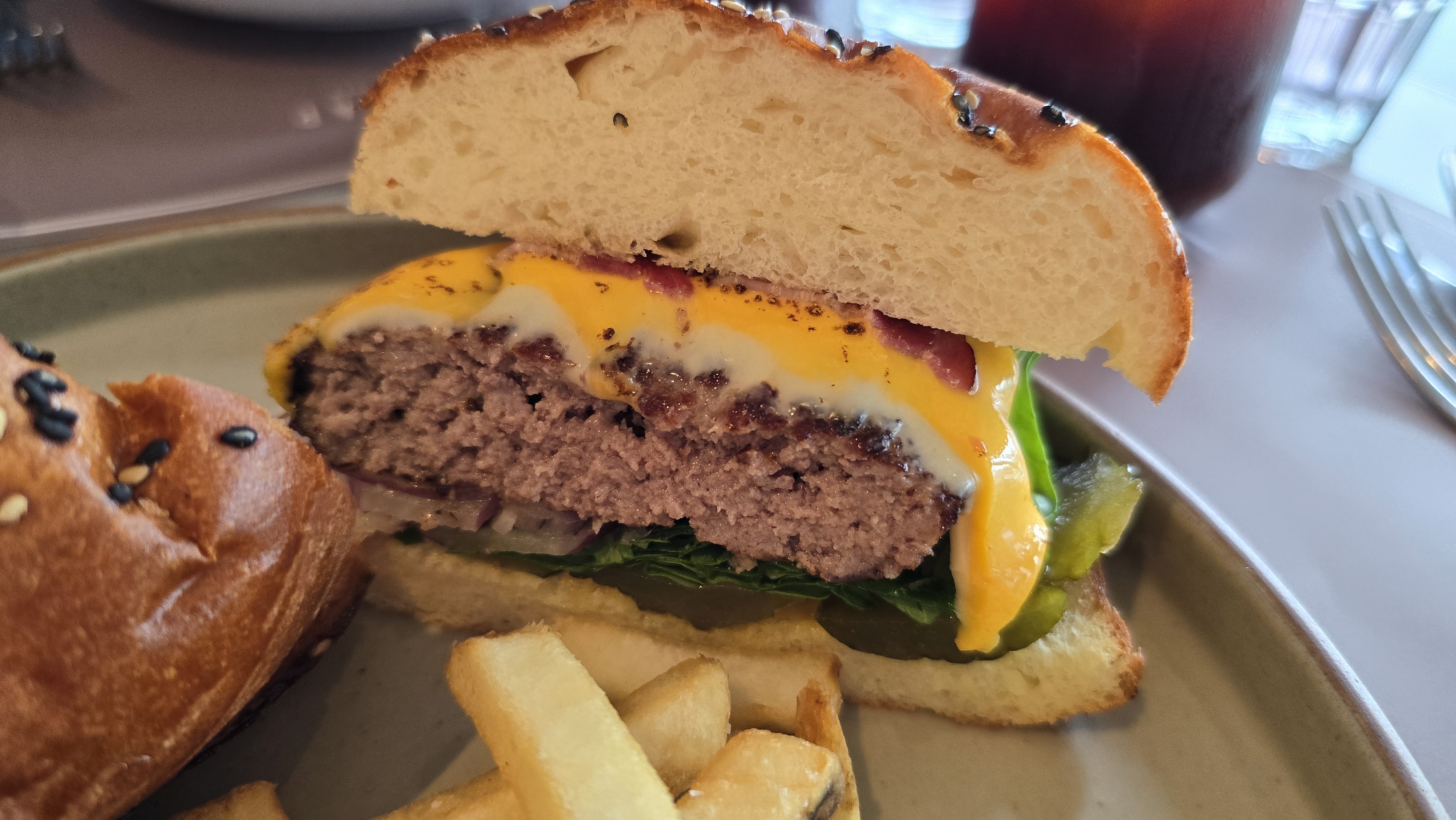 수제 패티의 맛과 향이 맛있었던 메뉴입니다. 막 엄청 맛있다 그런 맛은 아니고, 무난한 맛이었어요. 베이컨, 피클, 생양파, 양상추 대신 다른 채소?가 들어갔고요. 치즈 듬뿍이었습니다. 패티는 짭쪼름해서 유치원생 자녀도 잘 먹더라구요.