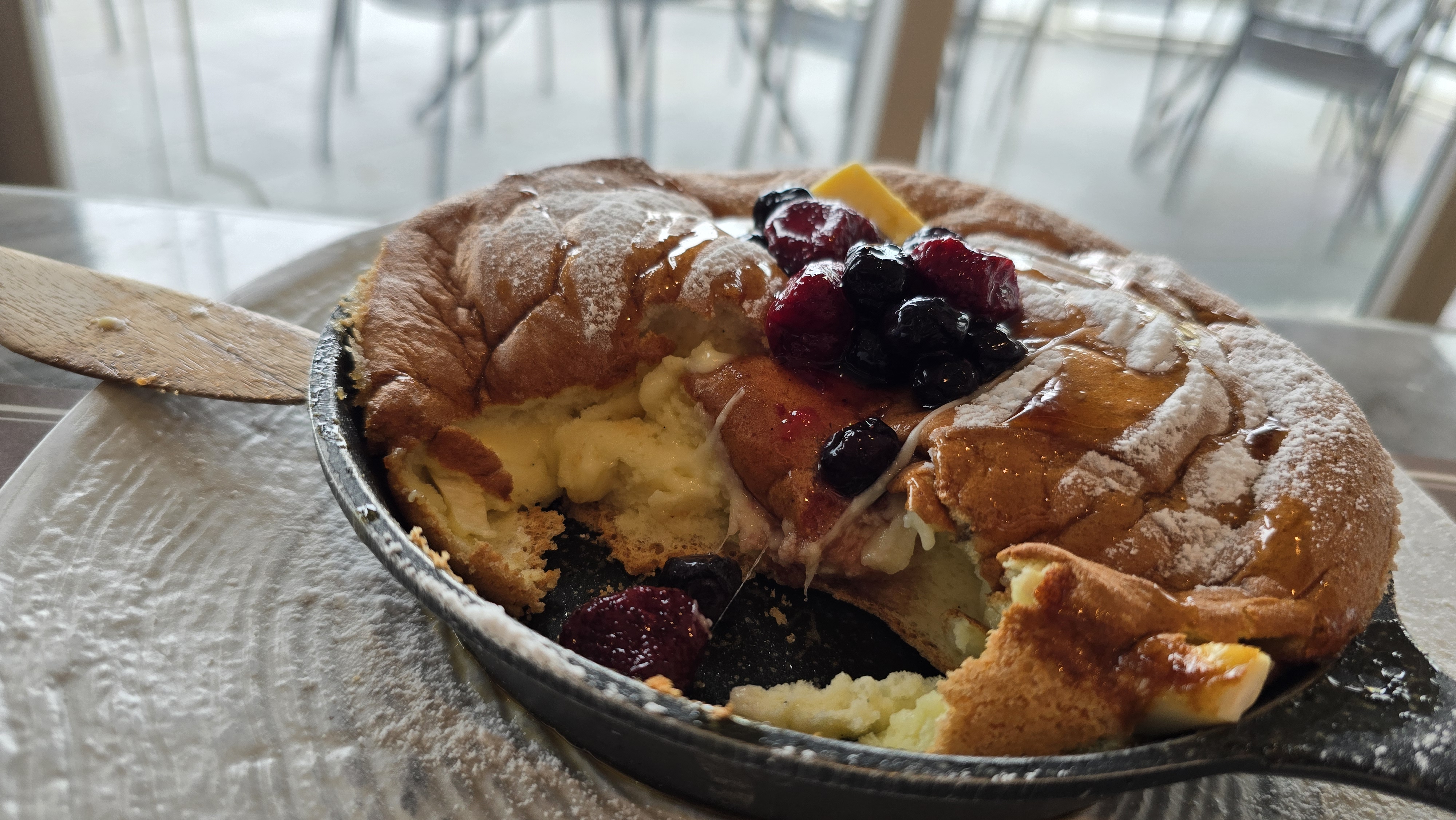 이번 메뉴 중에서 가장 만족스러웠던 수플레 팬케이크. 이미 식사를 먹은 뒤라 배부른 상태였는데도 너무 맛있었어요! 팬케이크 안에 치즈가 들어가있구요. 지금까지 먹었던 팬케이크 중에 가장 맛있었어요. 오키나와에 있는 유명한 수플레 팬케이크 집보다 맛있었어요.